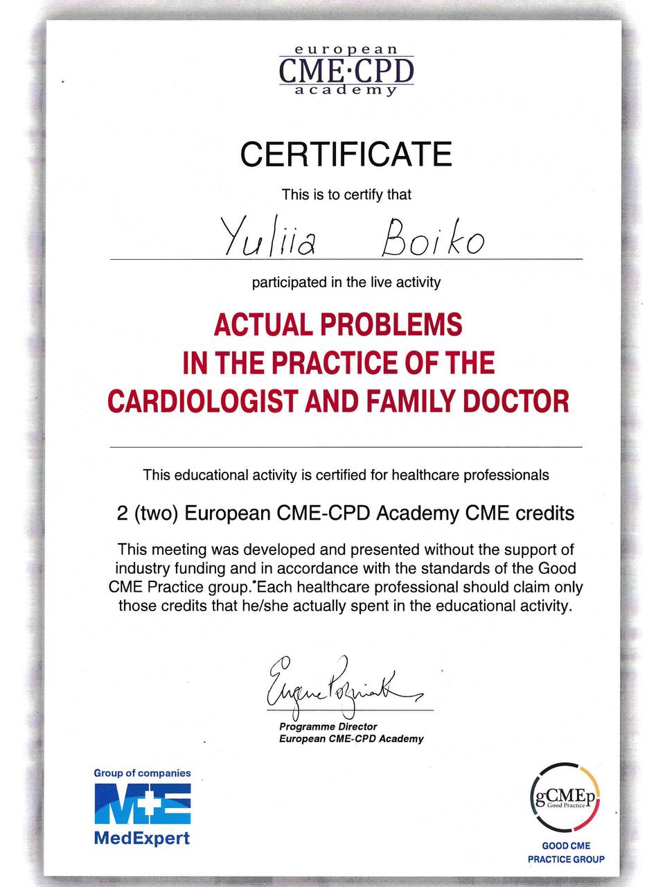 2015 – 2017 гг. – прохождение интернатуры по специальности «кардиология» – Национальная медицинская академия последипломного образования им. П.Л. Шупика.
