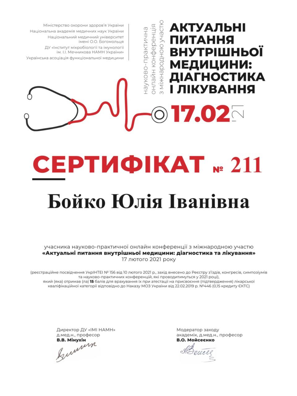 2015 – 2017 гг. – прохождение интернатуры по специальности «терапия» – Национальная медицинская академия последипломного образования им. П.Л. Шупика.