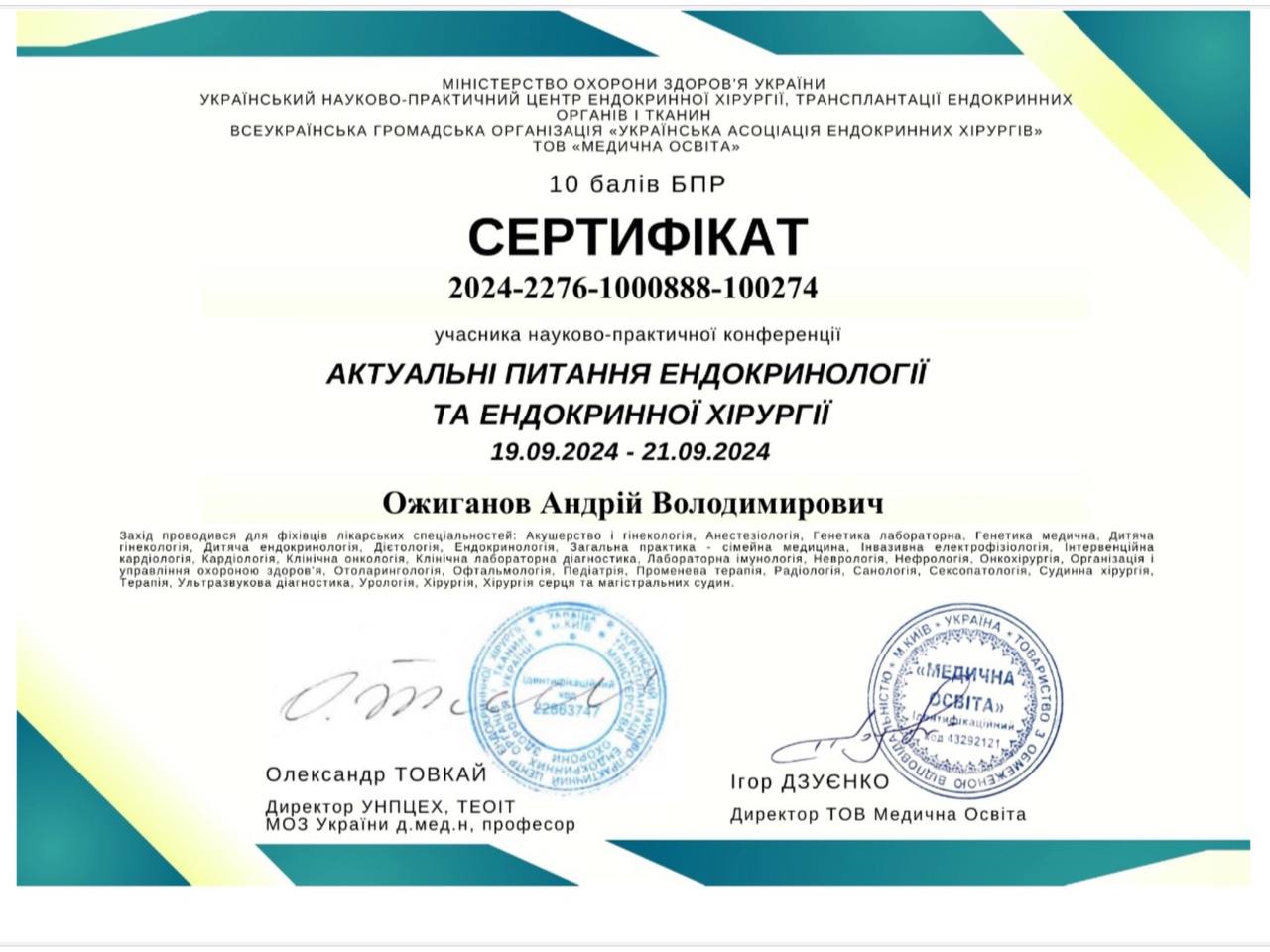 2021 г. – Специализация «эндокринная хирургия». ГПН «Украинский научно – практический центр эндокринной хирургии, трансплантации эндокринных органов и тканей МЗ Украины».