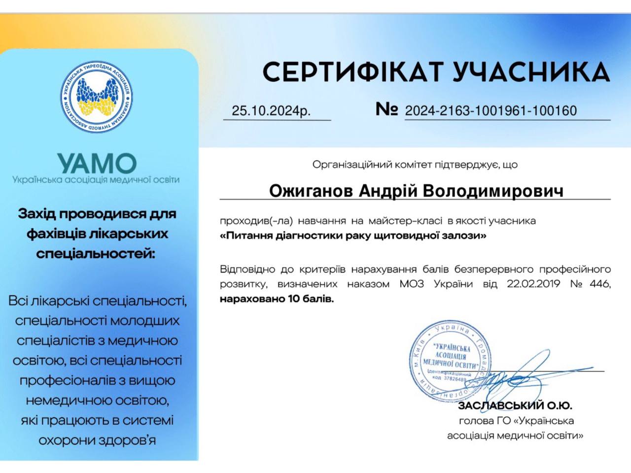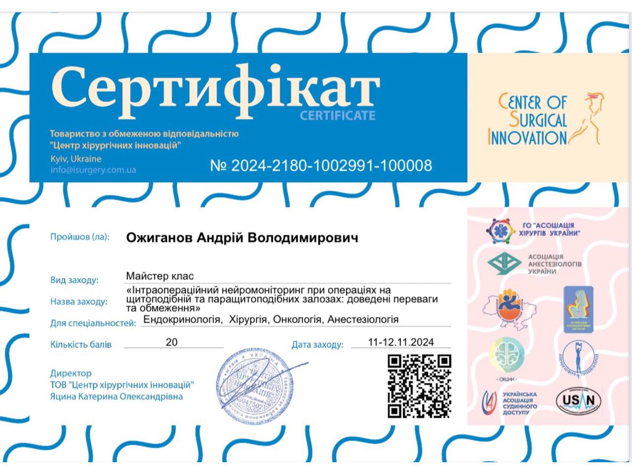 2024 г. – Специализация «онкохирургия». Национальный научный центр хирургии и трансплантологии им. О. О. Шалимова.