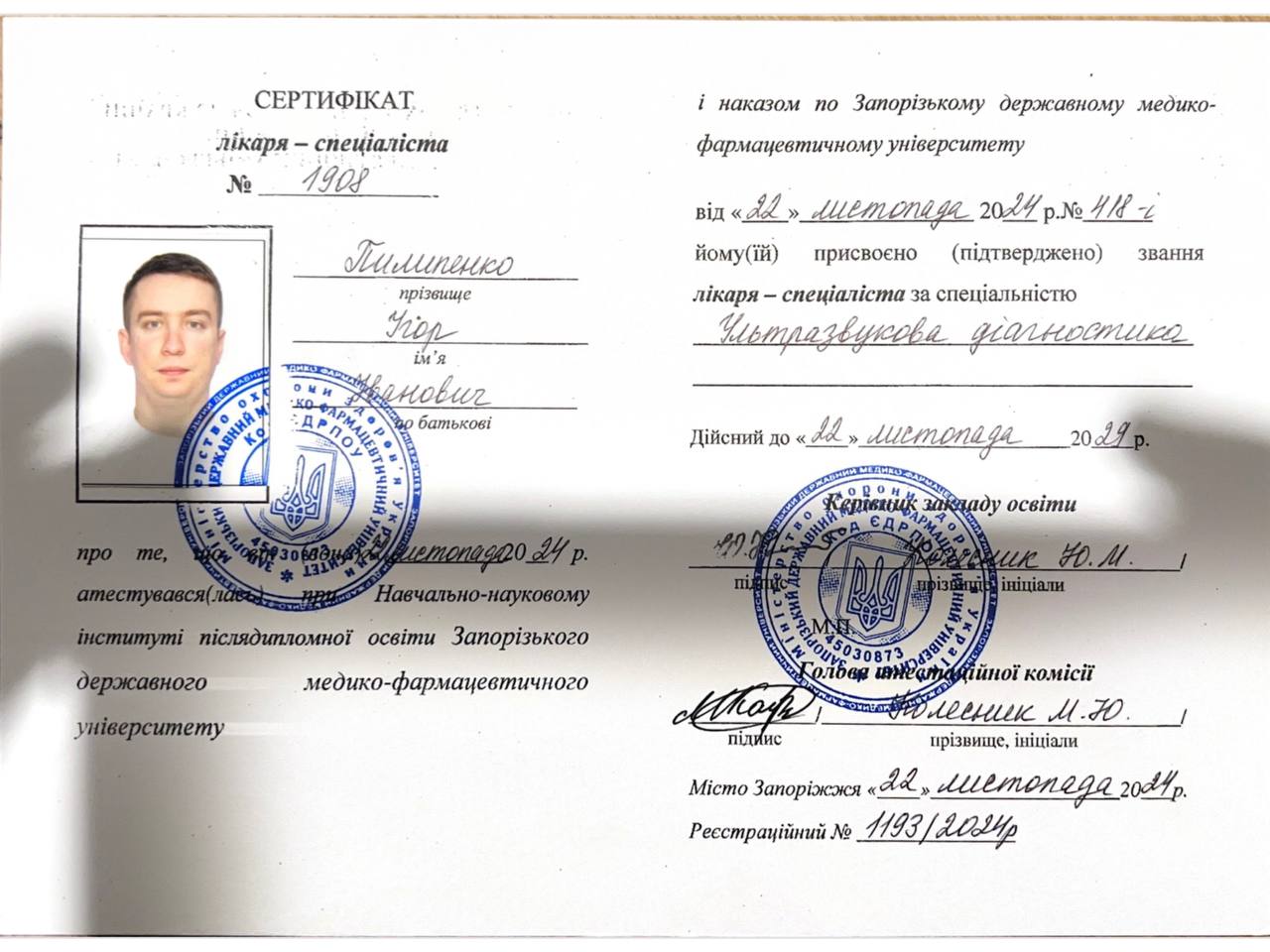 2024 г. – Специализация «ультразвуковая диагностика» – Запорожский государственный медико – фармацевтический университет.