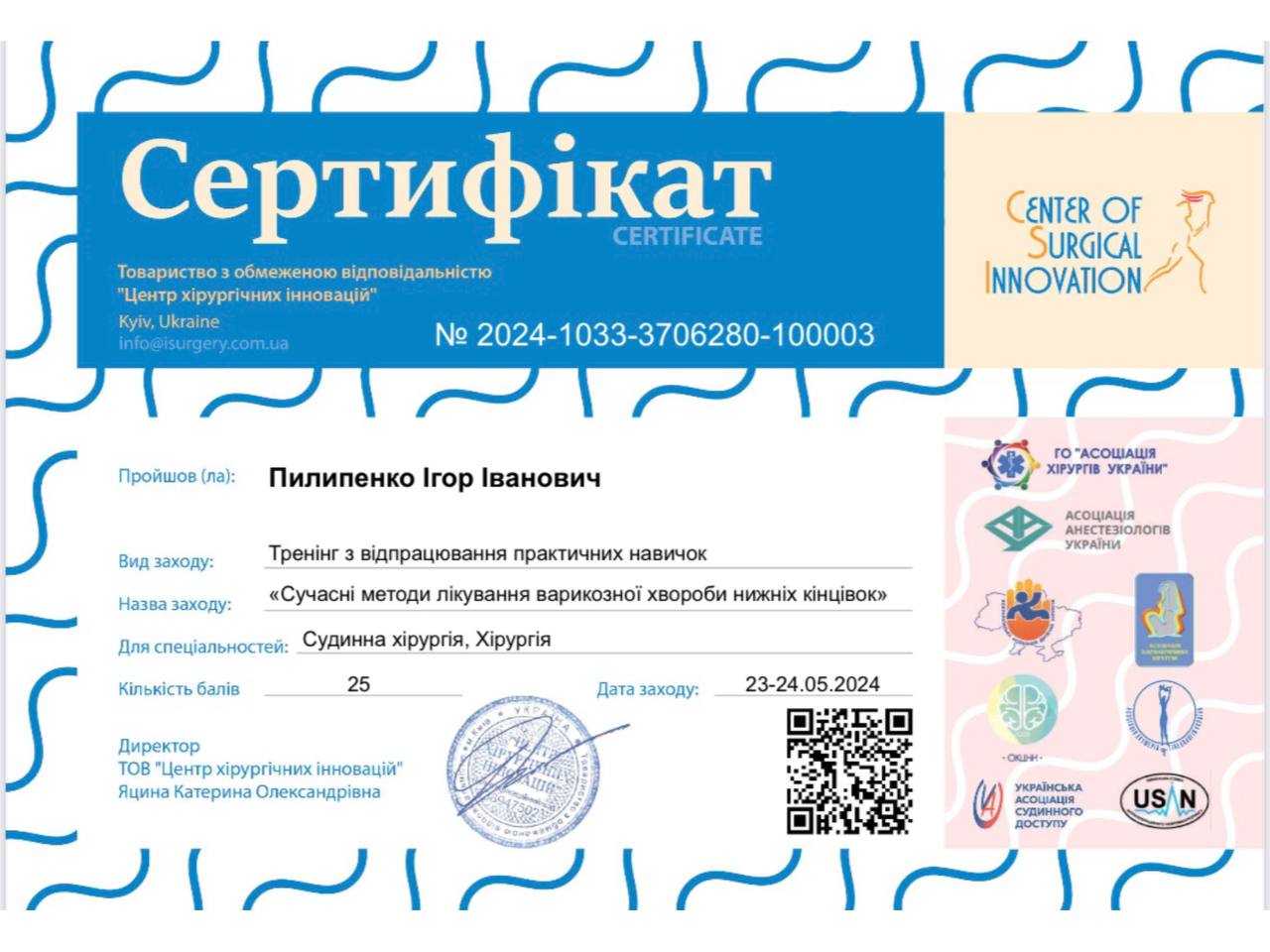 2024 – тренинг по отработке практических навыков «Современные методы лечения варикозной болезни нижних конечностей» Центр хирургических инноваций, ННЦХТ им. А. А. Шалимова, г. Киев.