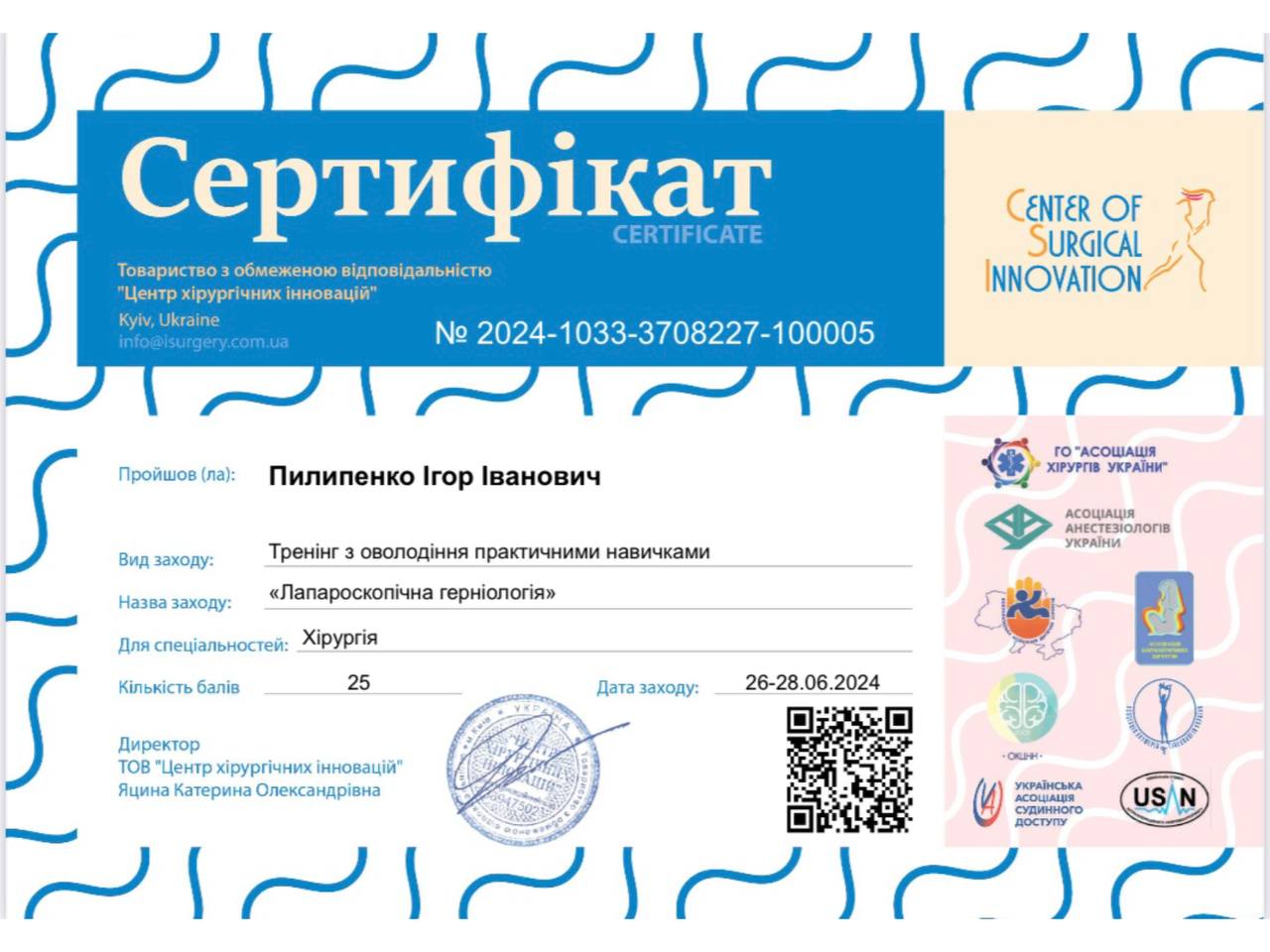 2024 – тренинг по отработке практических навыков «Лапароскопическая герниология» Центр хирургических инноваций, ННЦХТ им. А. А. Шалимова, г. Киев.