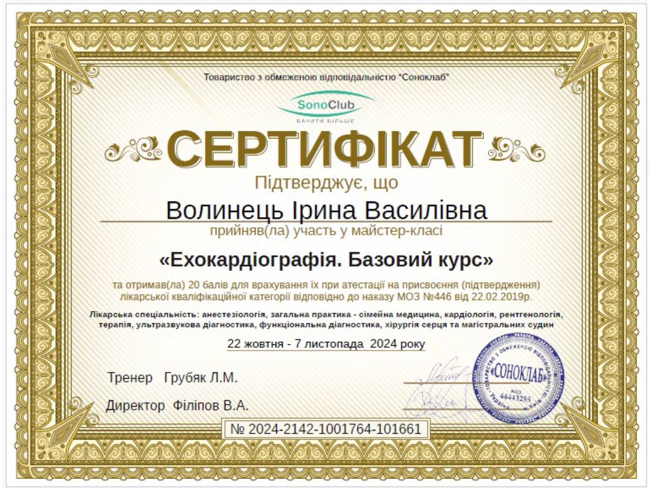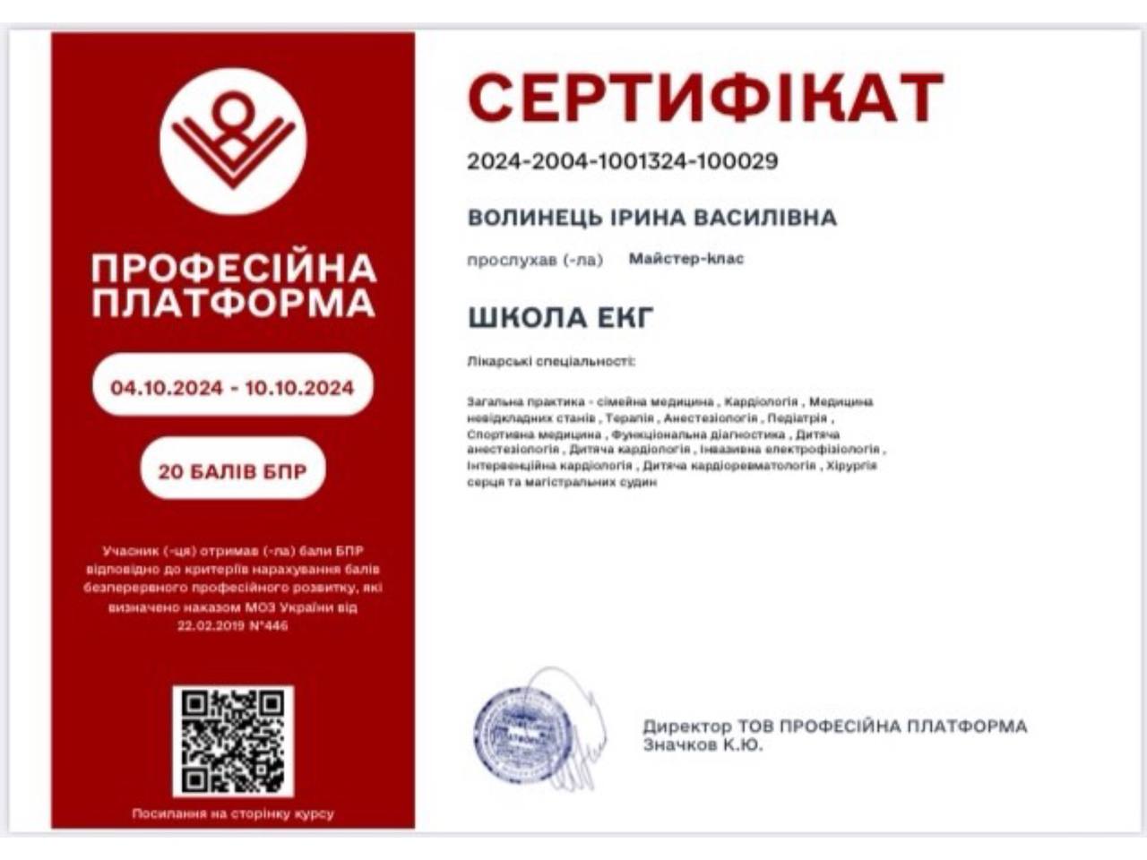 Член доплер-клуба Украины. Занимается доплерэхокардиографией с 1992 года, категория более высокая. Проводит обследование взрослым и детям: доплерэхокардиографию (УЗИ сердца), ЭКГ, спирографию.