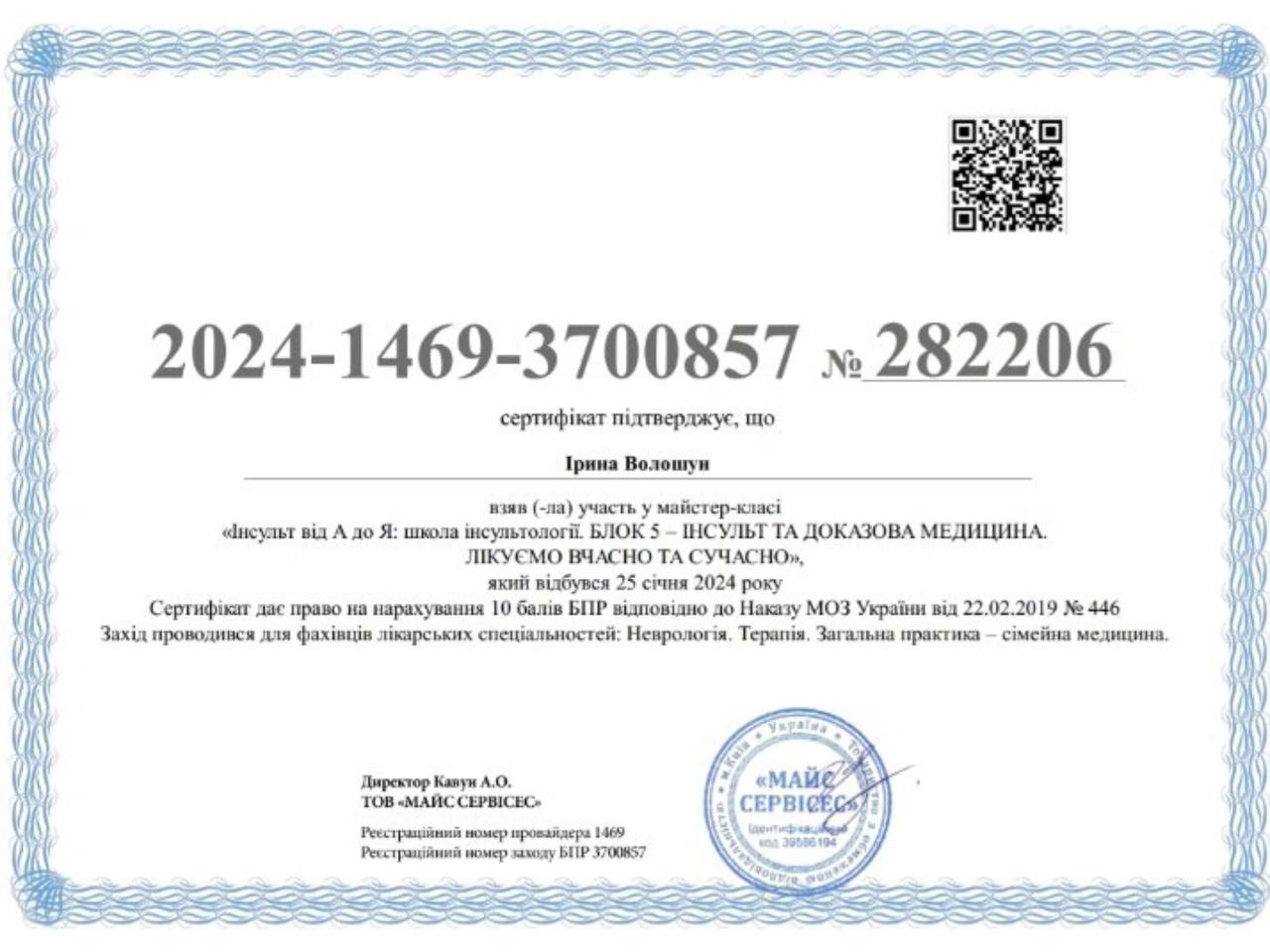 2007 – 2009 гг. – прохождение интернатуры по специальности «неврология» – Национальная медицинская академия последипломного образования им. П.Л. Шупика.