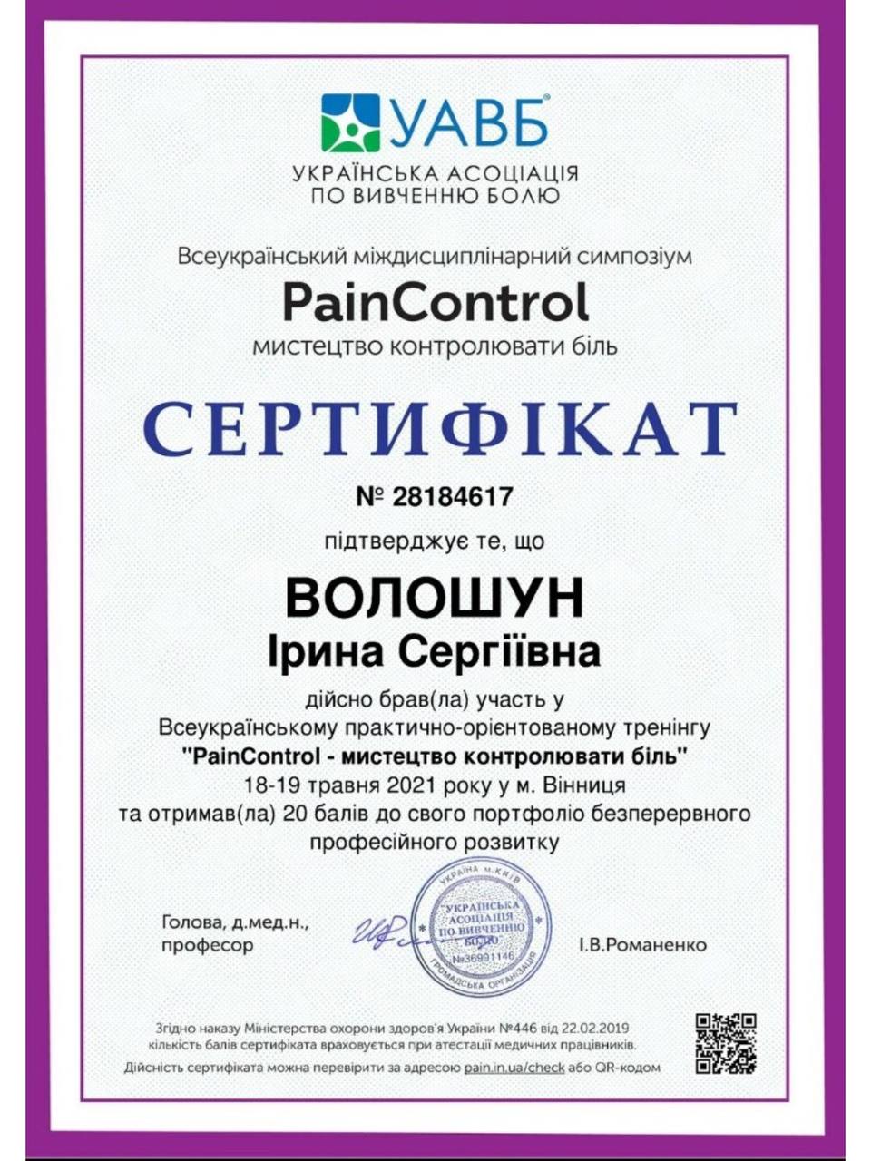 2021 г. – участие во Всеукраинском практически ориентированном тренинге "PainControl - искусство контролировать боль".