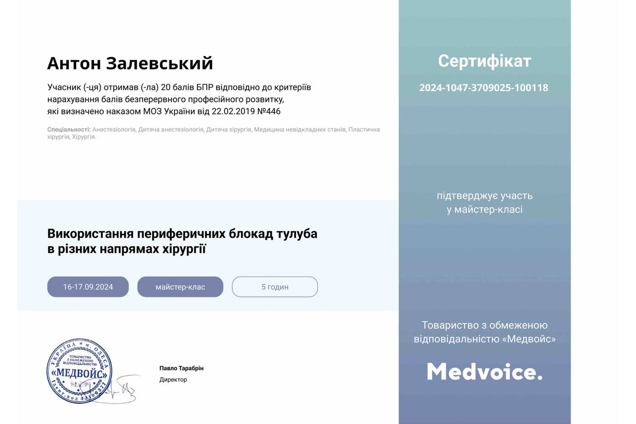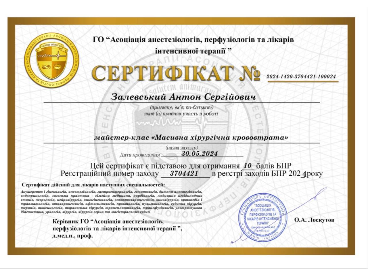 2014 – 2016 гг. – Национальная медицинская академия последипломного образования им. П.Л. Шупика. Специализация "Анестезиология и интенсивная терапия".