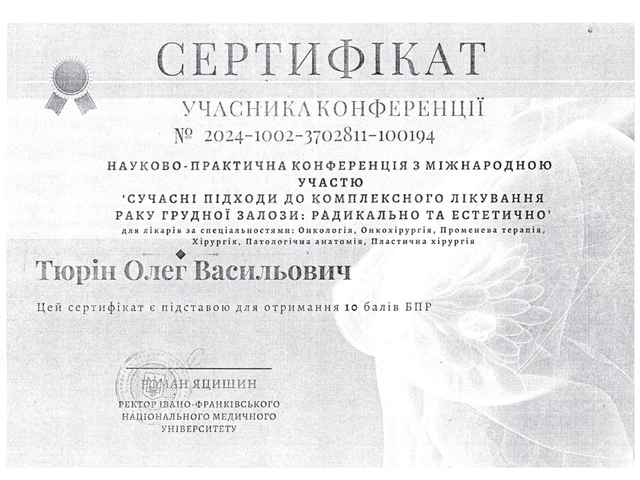 2024 р. – «Сучасні підходи до комплексного лікування раку грудної залози: радикально та естетично». м. Івано-Франківськ.