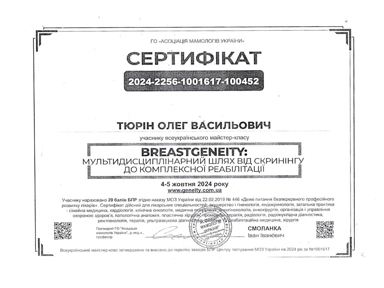 2024 р. – Breastgeneity: «Мультидисциплінарний шлях від скринінгу до комплексної реабілітації». м. Київ.